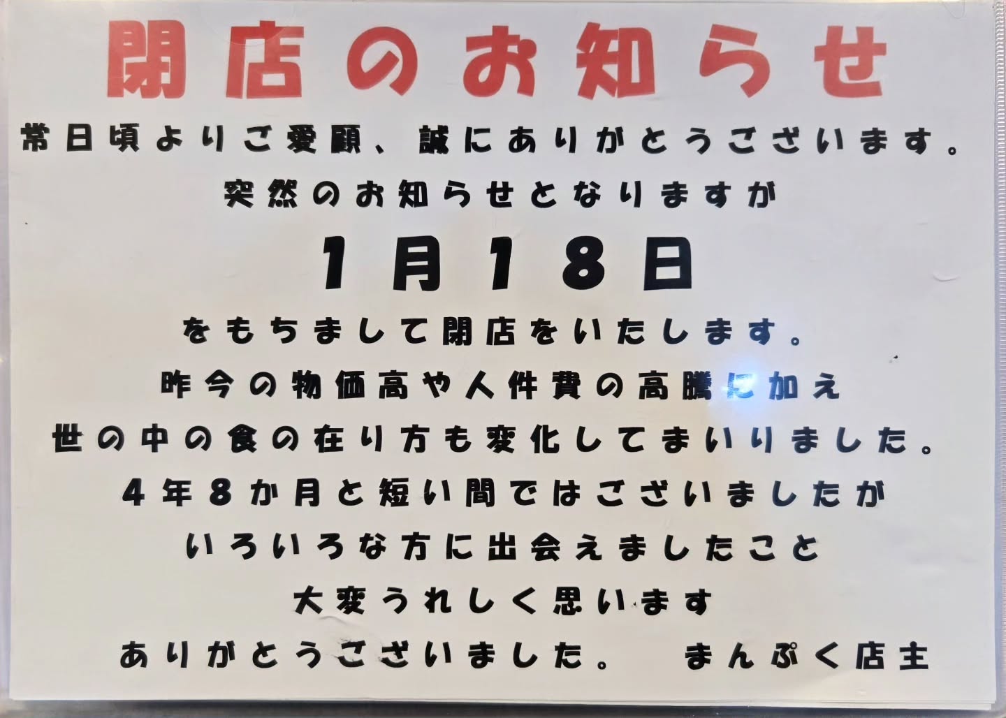 閉店までの営業のお知らせ。 #閉店#まんぷく駒岡 #トレッサ横浜 #ランチ定食